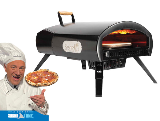 The premium Bertello propane gas burner attaches easily to oven and propane tank to heat the oven to 900 degrees in less than 20 minutes; the patent-pending wood burning tray sets right over the gas burner and can be accessed from above via a door that lets you drop on wood chips, pellets or lump charcoal (which is then automatically lit by the gas burner) in order to impart a wood-fire flavor to your pizza.